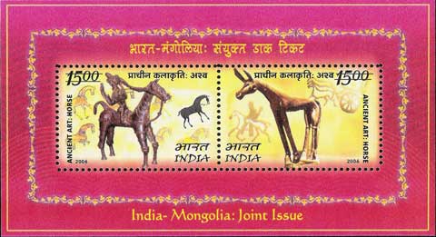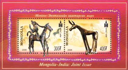 The other stamp depicts an ancient sculpture of a horse from Mongolia, an archaeological finding from the Bronze Age. The bronze cast statue was found in Murun city of Khuvsgul province of Mongolia.