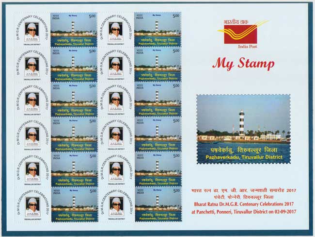 | 02.09.2017 | Tiruvallur District, Bharat Ratna Dr M G R Centenary Celebrations Stamp Design depicts Light House of Pazhaverkadu / My Stamp Words incorporated in Stamp Design / Dr. M. G. Ramachandran Stamp issued by India Post with text 'Dr. M.G.R. Centenary Celebrations 2017, Tiruvallur District' are pre-printed on the tab. Customised - 28 Security Printing Press, Hyderabad | Rs. 5 Rs. 500 per Sheetlet of 12 Stamps sold at ePost Office Portal with Presentation pack. | Light House | |