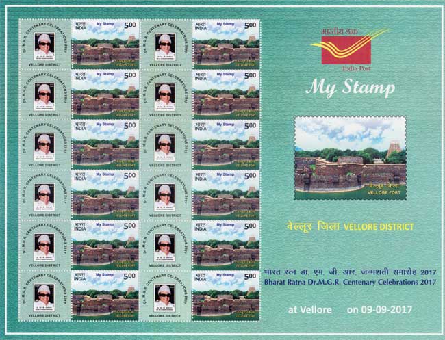 | 09.09.2017 | Vellore District, Bharat Ratna Dr M G R Centenary Celebrations Stamp Design depicts Vellore Fort / My Stamp Words incorporated in Stamp Design / Dr. M. G. Ramachandran Stamp issued by India Post with text 'Dr. M.G.R. Centenary Celebrations 2017, Vellore District' are pre-printed on the tab. Customised - 29 Security Printing Press, Hyderabad | Rs. 5 Rs. 500 per Sheetlet of 12 Stamps sold at ePost Office Portal with Presentation pack. | Vellore Fort | |