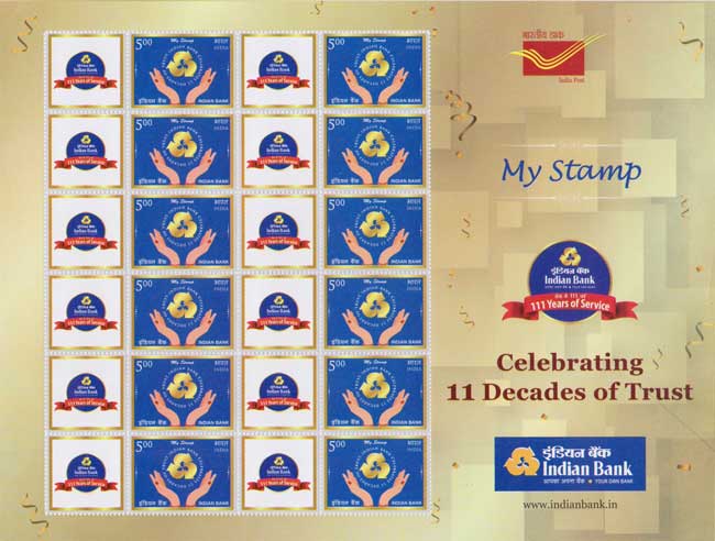 | 20.08.2017 | Indian Bank Stamp Design depicts two hands holding logo of Indian Bank / My Stamp words incorporated in stamp design / Logo of 111 years celebration of Indian Bank is pre-printed on the tab. Customised - 26 Security Printing Press, Hyderabad | Rs. 5 Rs. 500 per Sheetlet of 12 Stamps sold at ePost Office Portal with Presentation pack. | Banking, Finance | |