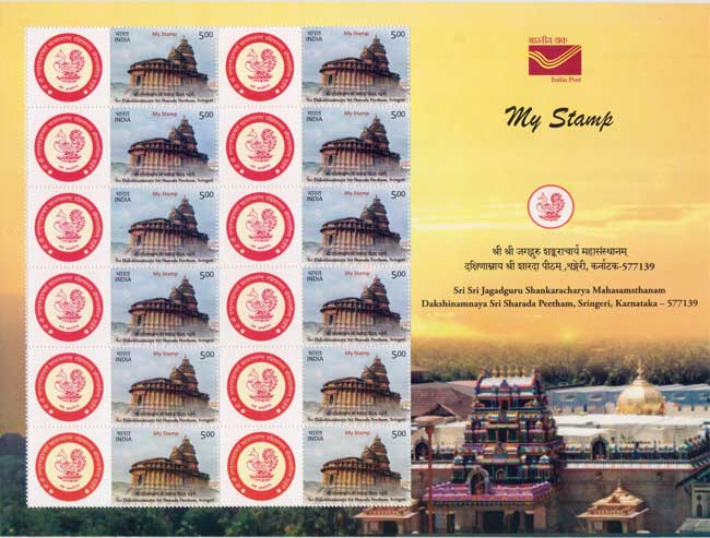 | 28.07.2017 | Dakshinamnaya Sri Sharda Peetham, Sringeri Stamp Design depicts Vidyashankar temple / My Stamp words incorporated in Stamp Design / Logo of Dakshinamnaya Sri Sharda Peetham, Sringeri is pre-printed on the tab Customised - 24 Security Printing Press, Hyderabad | Rs. 5 Rs. 500 per Sheetlet of 12 Stamps sold at ePost Office Portal with Presentation pack. | Vidyashankar temple, Religion | |