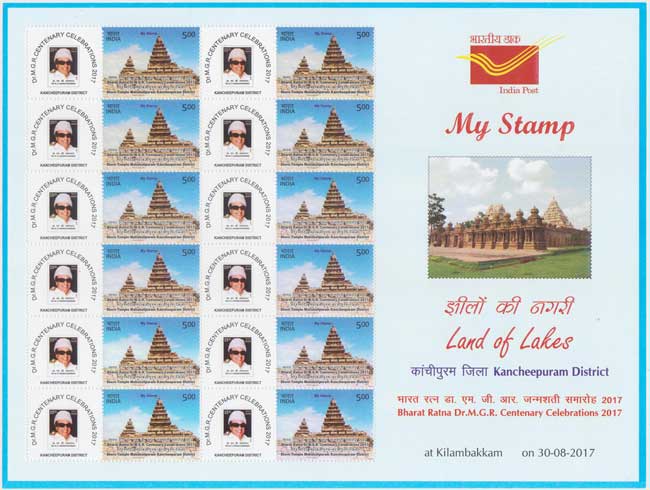 | 30.08.2017 | Land of Lakes, Kancheepuram District, Bharat Ratna Dr M G R Centenary Celebrations Stamp Design depicts Shore Temple of Mhabalipuram / My Stamp Words incorporated in Stamp Design / Dr. M. G. Ramachandran Stamp issued by India Post with text 'Dr. M.G.R. Centenary Celebrations 2017, Kancheepuram District' are pre-printed on the tab. Customised - 27 Security Printing Press, Hyderabad | Rs. 5 Rs. 500 per Sheetlet of 12 Stamps sold at ePost Office Portal with Presentation pack. | Shore Temple, Mahabalipuram, Kancheepuram District | |