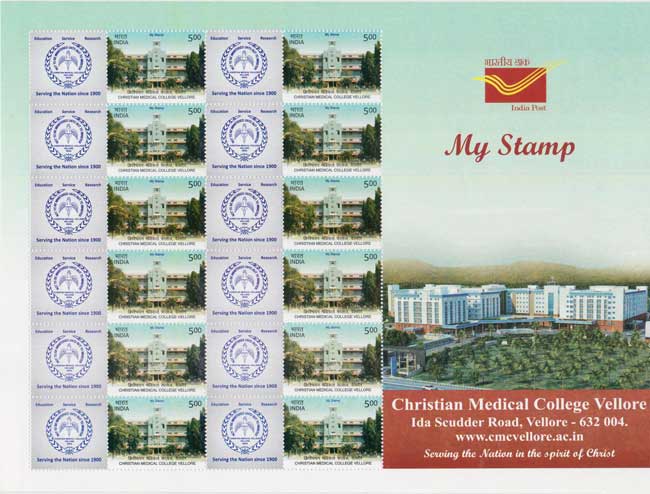 | 20.01.2017 | Christian Medical College, Vellore Stamp Design depicts Christian Medical College building / My Stamp words incorporated in Stamp Design / Logo of Christian Medical College is pre-printed on the tab. Customised - 18 Security Printing Press, Hyderabad | Rs. 5 Rs. 500 per Sheetlet of 12 Stamps sold at ePost Office Portal with Presentation pack. | Medicine, College, Eduction, Research, Hospital | |