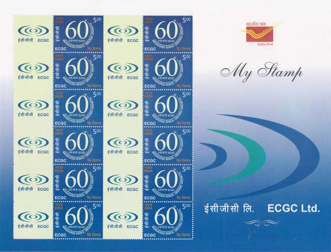 | 08.11.2016 | ECGC Ltd. Stamp design depict 60th Anniversary logo of ECGC Limited and text ECGC in Hindi and English / My Stamp words incorporated in Stamp Design / Logo of ECGC is pre-printed on the tab. Customised - 12 Security Printing Press, Hyderabad | Rs. 5 Rs. 500 per Sheetlet of 12 Stamps sold at ePost Office Portal with Presentation pack. | Emblem, Export Credit Guarantee Corporation of India Ltd. | |