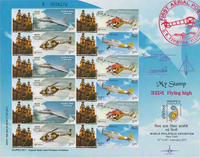 | 12.02.2011 | Flying High Personalised - 17 | Rs. 5 Rs. 150 per Sheetlet of 12 Stamps. Since Sept 2011 at Rs. 300 per Sheetlet of 12 Stamps | Helicopter, Aircraft, LCA-Tejas, Dhruv, Dhruv, HT-2. | |