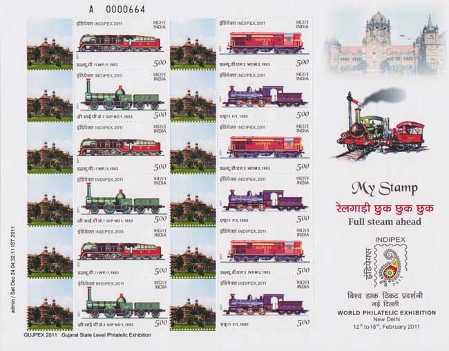 | 12.02.2011 | Full Steam Ahead Personalised - 15 | Rs. 5 Rs. 150 per Sheetlet of 12 Stamps. Since Sept 2011 at Rs. 300 per Sheetlet of 12 Stamps | Steam Engine, Railways, WP/1-1963, GIP No.1-1853, WDM2-1963 and F/1-1895 | |