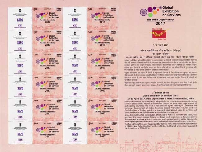 | 17.04.2017 | Global Exhibition on Services Stamp Design depicts Ashok Chakra and Circles in colours/ My Stamp words incorporated in the Stamp Design / Ashoka Pillar, Logo of SEPC and Logo of CII are pre-printed on the tab. Customised - 23 Security Printing Press, Hyderabad | Rs. 5 Rs. 500 per Sheetlet of 12 Stamps sold at ePost Office Portal with Presentation pack. | Exhibition, Trade Services, Exports | |
