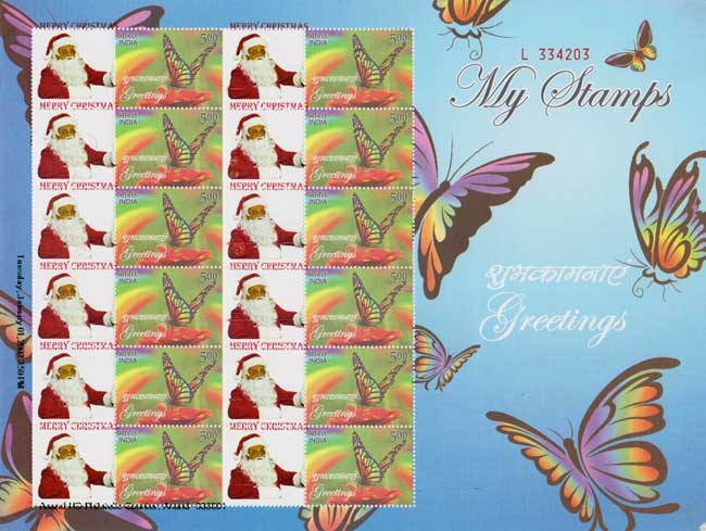| 16.07.2014 | Greetings Personalised - 30 India Security Press, Nasik | Rs. 5 Rs. 300 per Sheetlet of 12 Stamps. | Greetings, Butterfly | |