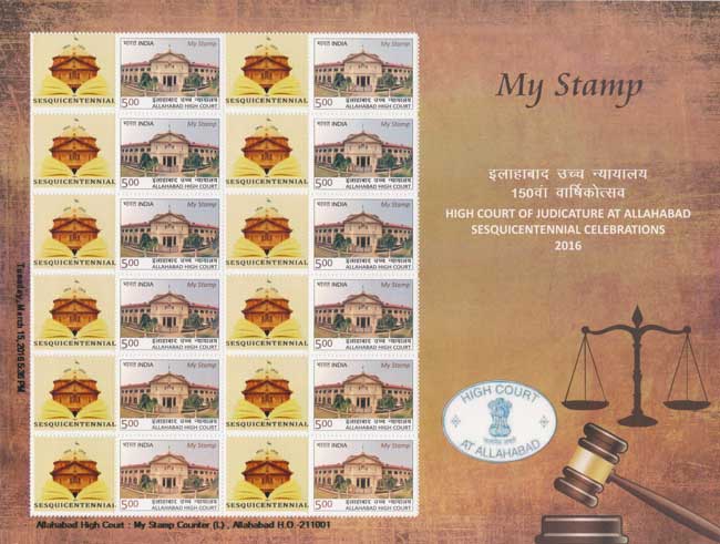| 13.03.2016 | High Court of Judicature at Allahabad, Sesquicentennial Celebrations 2016 My Stamp words incorporated in Stamp Design. Blank tab provided on left side for printing of image. Customised - 02 Security Printing Press, Hyderabad | Rs. 5 Rs. 300 per Sheetlet of 12 Stamps. Rs. 1000 per Sheetlet of 12 Stamps sold at ePost Office Portal with Presentation pack. | High Court, Judiciary, Building, Flag | |