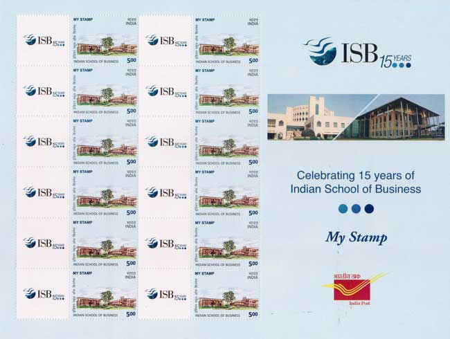 | 20.11.2016 | Indian School of Business Stamp design depict Sketch of Campus of Indian School of Business and text Indian School of Business in Hindi and English / My Stamp words incorporated in Stamp Design / Logo of 15 Years Celebration of Indian School of Business is pre-printed on the tab. Customised - 14 Security Printing Press, Hyderabad | Rs. 5 Rs. 500 per Sheetlet of 12 Stamps sold at ePost Office Portal with Presentation pack. | Education, Institute, Building | |
