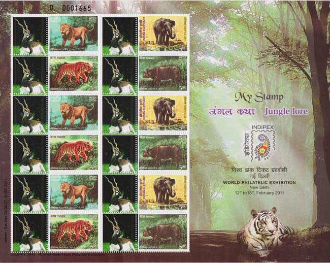 | 12.02.2011 | Jungle Lore Se-tenant Vertical Pairs: (i) Lion - Tiger (ii) Rhino - Elephant Personalised - 14 India Security Press, Nasik | Rs. 5 Rs. 150 per Sheetlet of 12 Stamps. Since Sept 2011 at Rs. 300 per Sheetlet of 12 Stamps | Wild Life, Animals, Lion, Tiger, Elephant, Rhino. | |