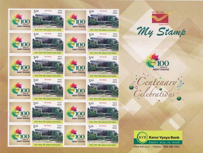 | 10.09.2016 | Karur Vyasya Bank Stamp design depicts buildings of Karur Vysya Bank / My Stamp words incorporated in Stamp Design / Logo of Centenary Celebration of Karur Vysya Bank is pre-printed on the tab. | Rs. 5 Rs. 500 per Sheetlet of 12 Stamps sold at ePost Office Portal with Presentation pack. | Building, Banking, Emblem | |