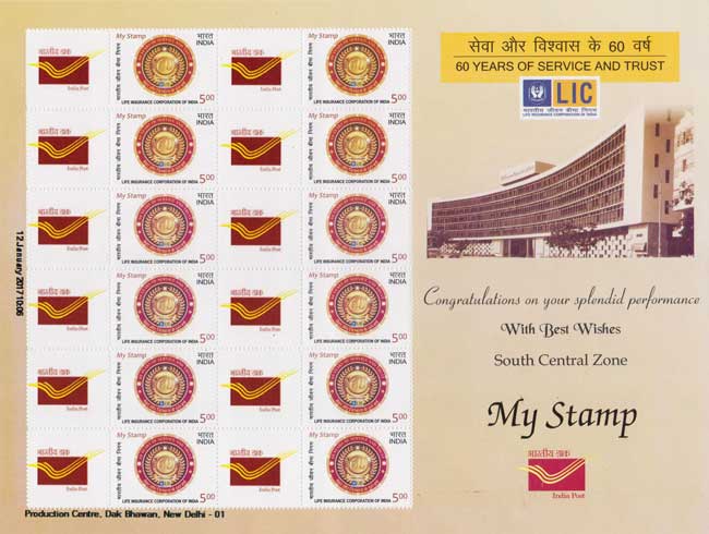| 04.11.2016 | Life Insurance Corporation of India Stamp design depict 60th Anniversary logo of Life Insurance Corporation of India and text Life Insurance Corporation of India in Hindi and English / My Stamp words incorporated in Stamp Design / Blank tab provided on left side for printing of image. Customised - 11 Security Printing Press, Hyderabad | Rs. 5 Rs. 500 per Sheetlet of 12 Stamps sold at ePost Office Portal with Presentation pack. | Insurance, Emblem, LIC | |