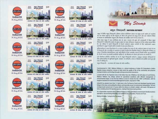 | 00.07.2017 | Mathura Refinary Customised - 25 | Rs. 5 Rs. 500 per Sheetlet of 12 Stamps sold at ePost Office Portal with Presentation pack. | Refinary, Tajmahal, Environment, Ecology | |