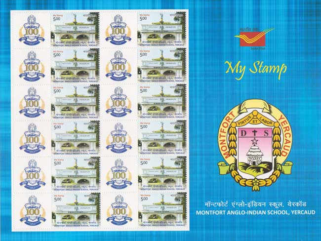 | 11.02.2017 | Montfort Anglo Indian School, Yercaud Stamp Design depicts building of Montfort Anglo Indian School / My Stamp words incorporated in Stamp Design / Logo of 100 Years Celebrations of Montfort Anglo Indian School is pre-printed on the tab. Customised - 21 Security Printing Press, Hyderabad | Rs. 5 Rs. 500 per Sheetlet of 12 Stamps sold at ePost Office Portal with Presentation pack. | Building, School, Education | |