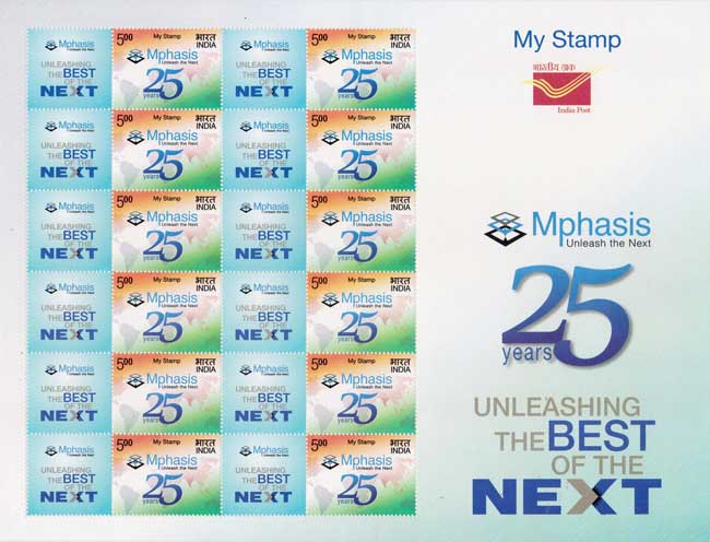 | 16.09.2016 | Mphasis Stamp design symbolizes the growth and influence of the Indian IT industry globally via national flag’s tricolor in digital code on the map of the world and also depicts Silver Jubilee celebrations Logo of Mphasis  / My Stamp words incorporated in Stamp Design /