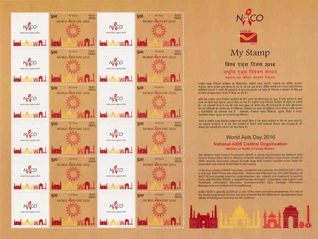 | 01.12.2016 | National AIDS Control Organisation Stamp design depicts Chain of Aids logo, images of Tajmahal, Charminar, India Gate and musical instruments / My Stamp words incorporated in Stamp Design / Logo of NACO and text India's Voice against AIDS and images of Tajmahal, Charminar, India Gate and musical instruments are pre-printed on the tab. | Rs. 5 Rs. 500 per Sheetlet of 12 Stamps sold at ePost Office Portal with Presentation pack. | Aids, Health, Tajmahal, Charminar, India Gate, Musical nstruments, Archaeology | |