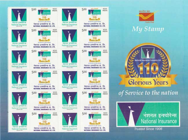 | 05.12.2016 | National Insurance Company Limited Stamp Design depicts Logo of National Insurance Company and text 110 Glorious Years of Service to the nation, National Insurance Co. Ltd./ My Stamp words incorporated in Stamp Design / Logo of National Insurance Company pre-printed on the tab. Customised - 16 Security Printing Press, Hyderabad | Rs. 5 Rs. 500 per Sheetlet of 12 Stamps sold at ePost Office Portal with Presentation pack. | Insurance, Emblem | |
