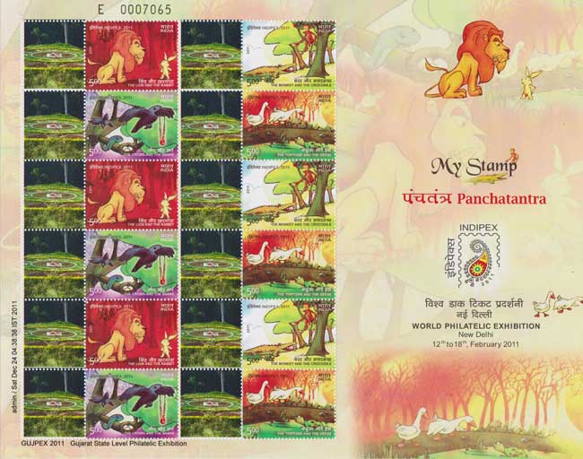 | 12.02.2011 | Panchatantra Personalised - 16 | Rs. 5 Rs. 150 per Sheetlet of 12 Stamps. Since Sept 2011 at Rs. 300 per Sheetlet of 12 Stamps | Lion, Rabbit, Crow, Snake, Monkey, Crocodile, Tortoise, Geese, Fable, Story | |