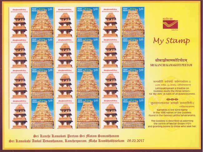 | 09.02.2017 | Sri Kanchi Kamakoti Peetam Stamp Design depicts Sri Kamakoti Vimanam / My Stamp words incorporated in Stamp Design / Image of Sri Kanchi Kkamakoti Peetam is printed on the tab. Customised - 19 Security Printing Press, Hyderabad | Rs. 5 Rs. 500 per Sheetlet of 12 Stamps sold at ePost Office Portal with Presentation pack. | Temple, Religion, Archaeology | |