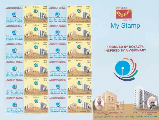 | 11.11.2016 | State Bank of Mysore Stamp design depicts old and new buildings of State Bank of Mysore and Portraits of Sir M. Visveswaraya, H. H. Nalvadi Krishnaraja Wadiyar / My Stamp words incorporated in Stamp Design / Logo of State Bank of Mysore and text 'Founded by Royalty, Inspired by a Visionary' and 'State Bank of Mysore' are pre-printed on the tab. | Rs. 5 Rs. 500 per Sheetlet of 12 Stamps sold at ePost Office Portal with Presentation pack. | Banking, Building, Emblem, Personality, Sir M. Visveswaraya, H. H. Nalvadi Krishnaraja Wadiyar | |