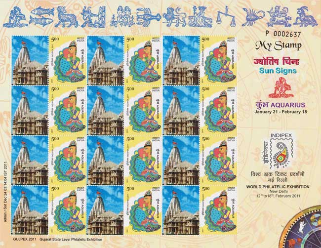 | 12.02.2011 | Sun Sign Personalised - 02 India Security Press, Nasik | Rs. 5 Rs. 150 per Sheetlet of 12 Stamps. Since Sept 2011 at Rs. 300 per Sheetlet of 12 Stamps | Sun Sign,  Astrology, Zodiac Sign, Aquarius | |