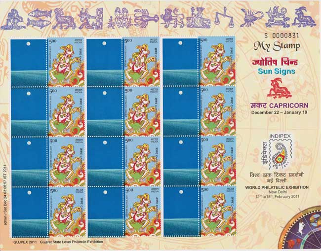 | 12.02.2011 | Sun Sign Personalised - 01 India Security Press, Nasik | Rs. 5 Rs. 150 per Sheetlet of 12 Stamps. Since Sept 2011 at Rs. 300 per Sheetlet of 12 Stamps | Sun Sign, Astrology, Zodiac Sign, Capricorn | |