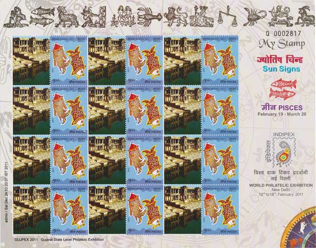 | 12.02.2011 | Sun Sign Personalised - 03 India Security Press, Nasik | Rs. 5 Rs. 150 per Sheetlet of 12 Stamps. Since Sept 2011 at Rs. 300 per Sheetlet of 12 Stamps | Sun Sign,  Astrology, Zodiac Sign, Pisces | |