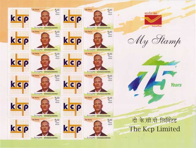 | 30.12.2016 | The KCP Limited Stamp Design depicts Portrait of Velagapudi Ramakrishna, founder chariman of KCP Group / My Stamp Words incorporated in Stamp Design / Logo of KCP Group pre-printed on the tab. Customised - 17 Security Printing Press, Hyderabad | Rs. 5 Rs. 500 per Sheetlet of 12 Stamps sold at ePost Office Portal with Presentation pack. | Personality (Velagapudi Ramakrishna, founder chairman of the KCP Group of Companies), Industry, Business | |