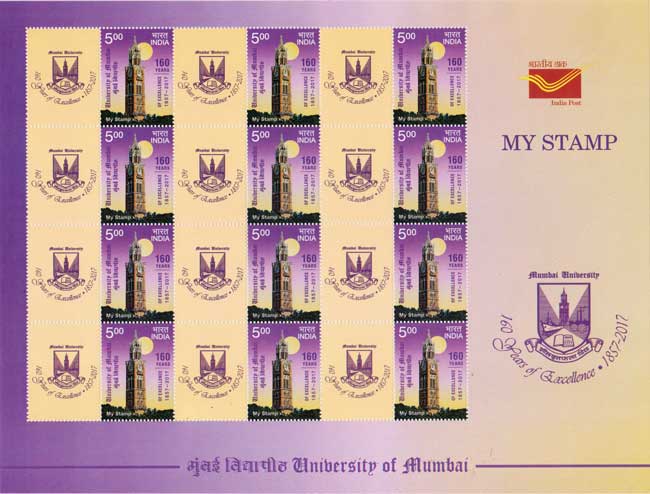 | 17.03.2017 | University of Mumbai Stamp Design depicts Tower of University of Mumbai building / My Stamp words incorporated in the stamp design / Logo of University of Mumbai is pre-printed on the tab. Customised - 22 Security Printing Press, Hyderabad | Rs. 5 Rs. 500 per Sheetlet of 12 Stamps sold at ePost Office Portal with Presentation pack. | University, Education, Clock Tower | |