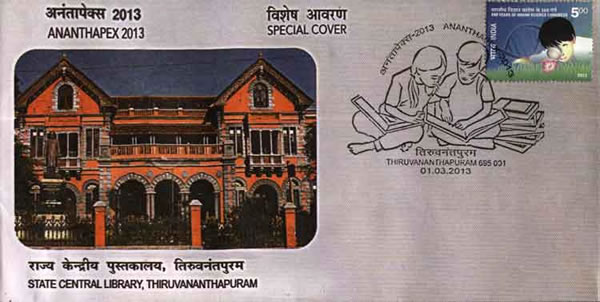 On the second day (1st March 2013) of the Exhibition, Shri A. Govindarajan, Director,  Postal Services (HQ), Thiruvananthapuram released a Special Cover on State Central Library, Thiruvananthapuram. State Central Library of  Thiruvananthapuram was established in 1829, during the reign of His Highness Swathi Thirunal Maharaja of Travancore. It is also known as the Public Library and it  is one of the oldest libraries in India.  Since 1900 the Public Library is housed in a beautiful, gothic style heritage building in the heart of the Capital, it has many rare books and gazettes.  It is the first State Library to be fully computerised in the country.