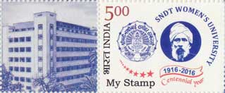 SNDT Women's University. Stamp design depicts Logo of University and centennial year logo depicting image of Maharshi Karve / My Stamp words incorporated in Stamp Design / Image of SNDT University Building is pre-printed on the tab. Customised - 08 Security Printing Press, Hyderabad |