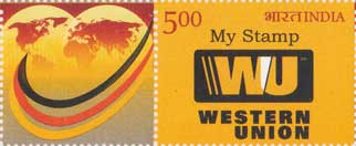 Western Union - Transforming Lives since 15 years Stamp design depicts the Western Union logo. / My Stamp words incorporated in Stamp Design / Flow of remittances is pre-printed on the tab. Customised - 06 Security Printing Press, Hyderabad |