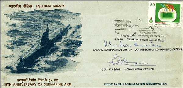 A new page of history was written on board the Indian submarine ‘INS Kalvari’ on 8th December 1982, when the Indian Navy and department of posts jointly provided a special cancellation, 30 meter under the deep waters of the Bay of Bengal.